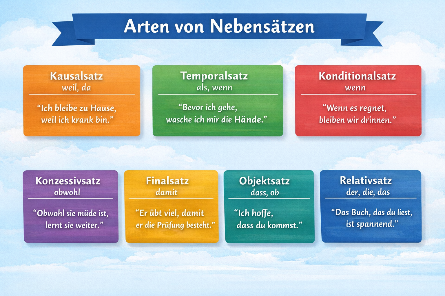 Es gibt verschiedene Arten von Nebensätzen. Für den Schulalltag sind vor allem diese wichtig: