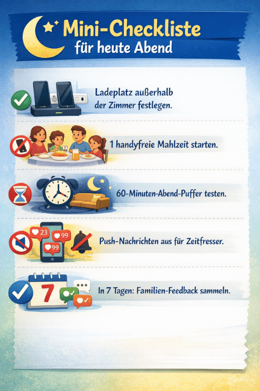 Ein gemeinsamer „Handy-Parkplatz“ in der Küche ist oft effektiver als jede App. Und: weniger Diskussionen („Ich brauch’s als Wecker!“ → günstiger Wecker regelt).